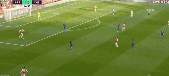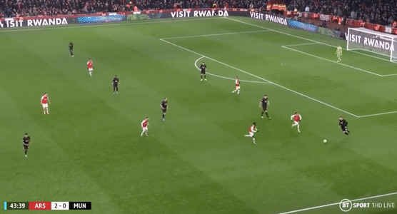In forming this overload in the midfield, Arsenal are able to attack in numbers while still retaining their shape and control in the middle of the park. As an inverted fullback, Maitland-Niles spends the majority of his time in the half space, essentially playing as a right-sided holding midfielder. The system plays to his strengths and enables him to occupy a position he is very comfortable with when Arsenal have the ball. Not only that, but he is far more suited to this role than Hector Bellerin — who has excelled at right-back in the past when given license to bomb forward, often hugging the flank in the process.