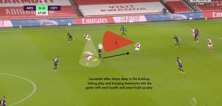 The three pictures below provide an insight into Lacazette’s role in recent games, and exactly what Arteta expects from his center forward: involvement in the build-up, a key role in final-third play, and the kickstart for the press from the front.