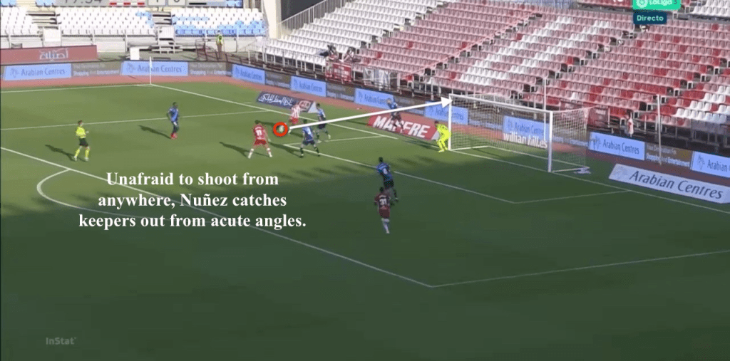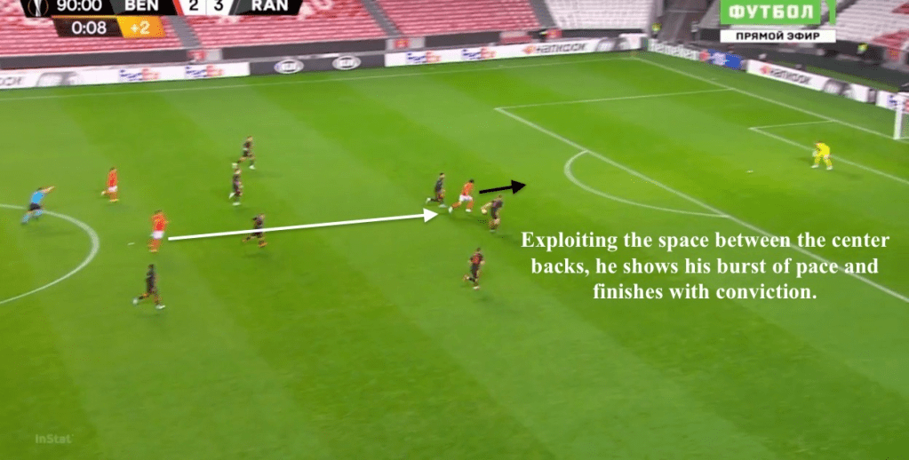 His goalscoring numbers and conversion rate must improve to reach the pinnacle of top-level center forwards, but his Europa League numbers (5 in 5) somewhat offset his relatively disappointing goal rate in the league. Strong with both feet, dangerous in the air (he stands at 6’2), and capable from distance (see the gifs below), he’s got a wide variety of finishes in his locker.