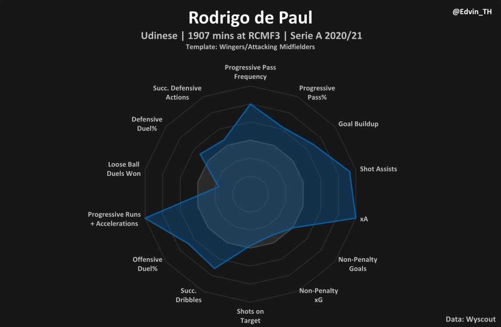 Since joining Udinese before the 2015/2016 season, De Paul has become an ever-increasingly important member of the Serie A side, from budding young midfielder to senior Argentinian international and club captain. De Paul predominantly lines up on the right of the midfield three in Udinese’s 3-5-2 system, tasked with progressing the ball from deep into the final third, and relied upon as the primary chance creator in the side. The radar below, created by @Edvin_TH, highlights just how effective he is in his ball progression and creation, while also providing an insight into the qualities he lacks – which we’ll take a closer look at later on. He does his best work when drifting between central positions and the right half-space, picking up smart pockets and relentlessly advancing the ball into dangerous areas via dribbles or passes.
