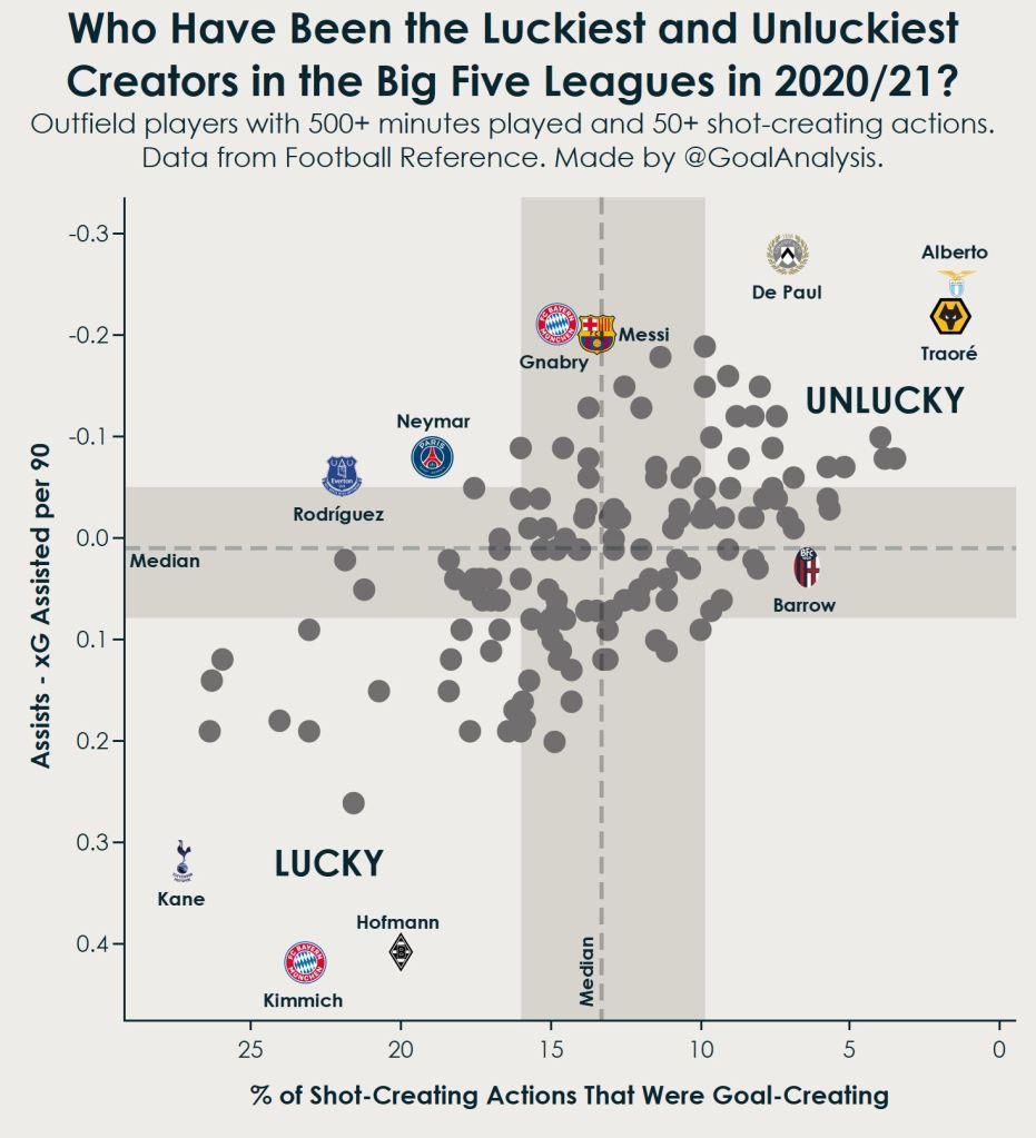 With just one recorded assist this season, De Paul’s creative stats, from afar, don’t exactly jump off the screen. When delving deeper, however, it’s quite clear that De Paul is a fantastic chance creator that has been criminally let down by teammates. 5.9 expected assists (2nd in Serie A), 4.99 shot-creating actions p/90 (5th), and 2.68 key passes p/90 (4th) suggests he’s one of the outstanding creative players in the league. Sam/@GoalAnalysis (a must-follow) backed up this perception with his recent scatter plot, which highlighted that De Paul is one of the unluckiest creators in Europe. Constantly providing, constantly let down.