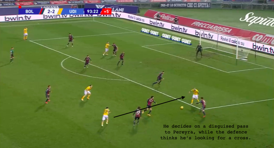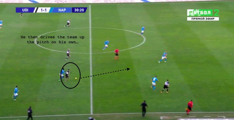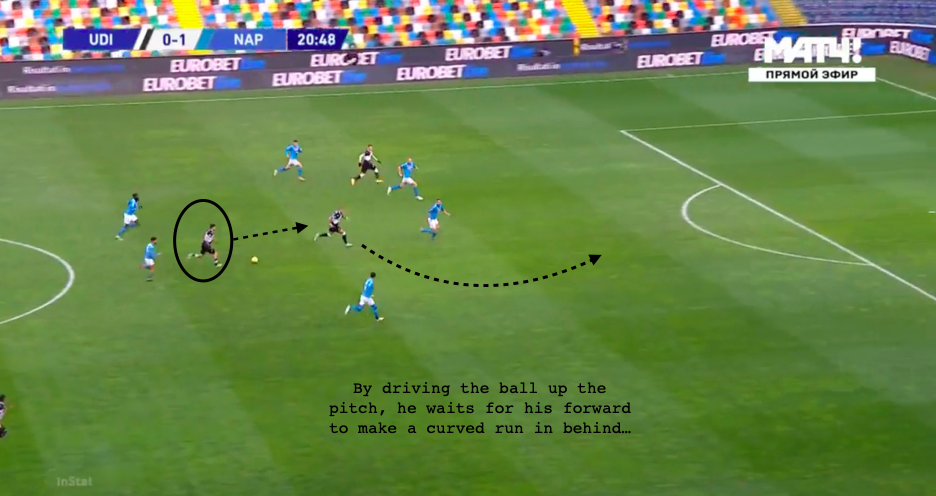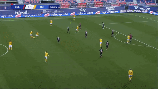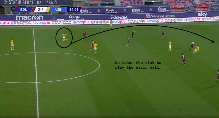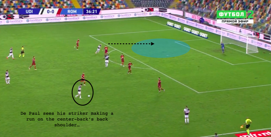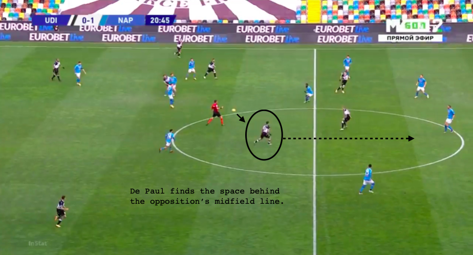 De Paul has also displayed an ability to dictate and progress play against deeper blocks, and is comfortable receiving the ball from his center backs before executing dangerous lofted balls in-behind the opposition backline. His range of passing is impressive, and as the key figure in Udinese’s side, he fulfills a number of midfield roles — that of an 8 when progressing play, that of a 6 when spraying measured passes from deep, and that of a 10 when creating chances in the final-third.