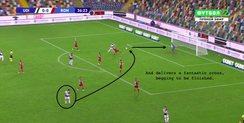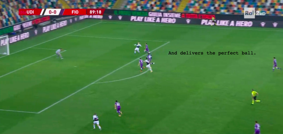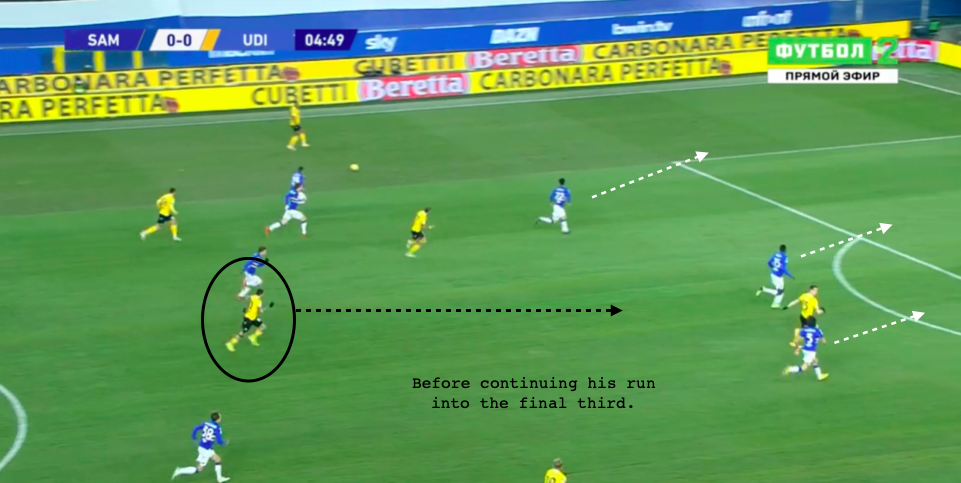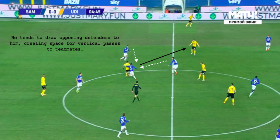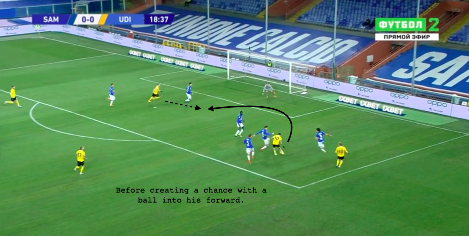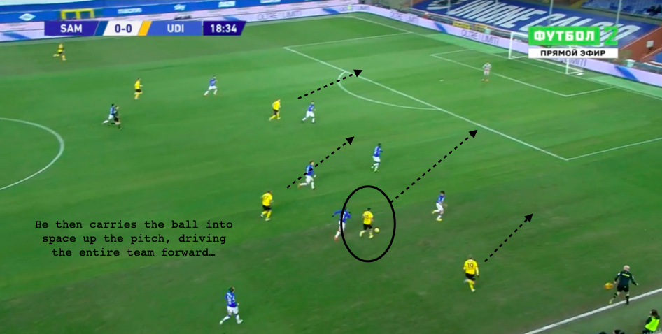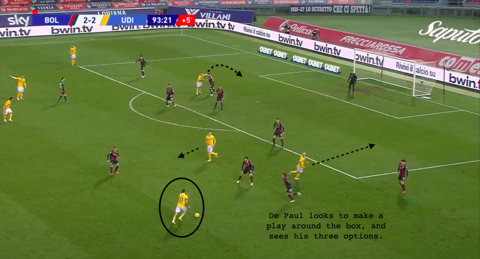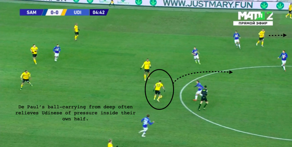 De Paul has generated attention this season for his excellent, chart-topping ball progression and creative numbers. As mentioned earlier, his role in this Udinese side reminds us of Jack Grealish’s at Aston Villa last season; we hate to use the phrase, but he’s star-figure in a one-man team. Every Udinese move seems to run through the Argentinian; at times, his teammates look devoid of ideas and resort to finding De Paul – regardless of his position on the pitch.