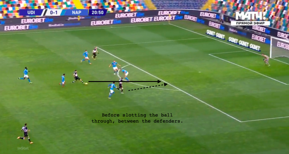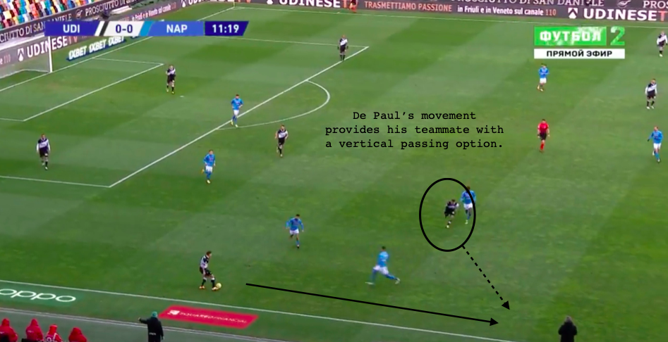 De Paul also chooses the right moments to release sooner, receiving the ball in smart areas before executing incisive forward passes for teammates. His 7.42 progressive passes p/90 rank 6th in Serie A this season, while he’s also equally effective further up the pitch – averaging 5.61 passes into the final third and 2.58 into the penalty area. The Argentinian is relentless in his intent to progress the ball quickly up the field – and is constantly the influential figure in moving his side into dangerous areas. In doing so, he often attracts a multitude of defenders, opening up space for teammates in the process. Sides are aware of the ability he possesses, are forced to over-compensate in an attempt to slow him down, and are subsequently out of position when De Paul finds his teammates in space with a penetrative vertical pass.