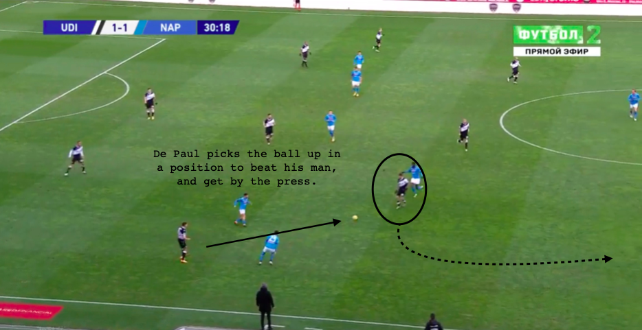 His most impressive trait is his ball progression. Both on the dribble and by way of crisp, vertical passes, De Paul is so effective at making himself an option in the build-up or in transition, before receiving the ball and driving his side forward from deep into attacking areas. The Argentinian has averaged 9.8 progressive carries and 4.49 carries into the final third per 90 this season, which both rank in the top five in Serie A. The slideshows below portray two scenarios in which De Paul receives and then progresses the ball from deep: he exhibits a positive, purposeful first-touch, the speed and gait to beat his marker, and the awareness of space to identify gaps to drive into.