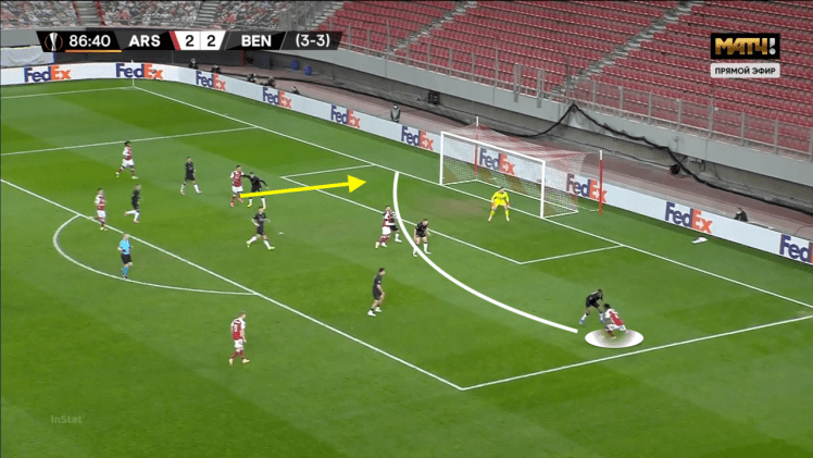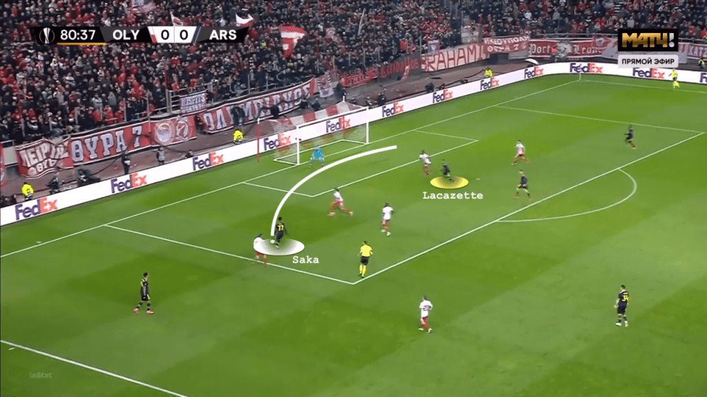 ‘This is like ordering your striker to move into the danger zone. It’s actually world-class. Really, really good. Ryan Giggs used to give those passes, Dennis Bergkamp, Paul Scholes,’ said Robin Van Persie after Saka’s assist as makeshift left back at the beginning of Arteta’s reign. Saka receives a pass from Aubameyang, takes one touch towards the byline, and then fizzes in a cross begging to be finished, so Lacazette obliges. During this time, the youngster developed the first of his final actions in possession: the teasing cross from wide left.