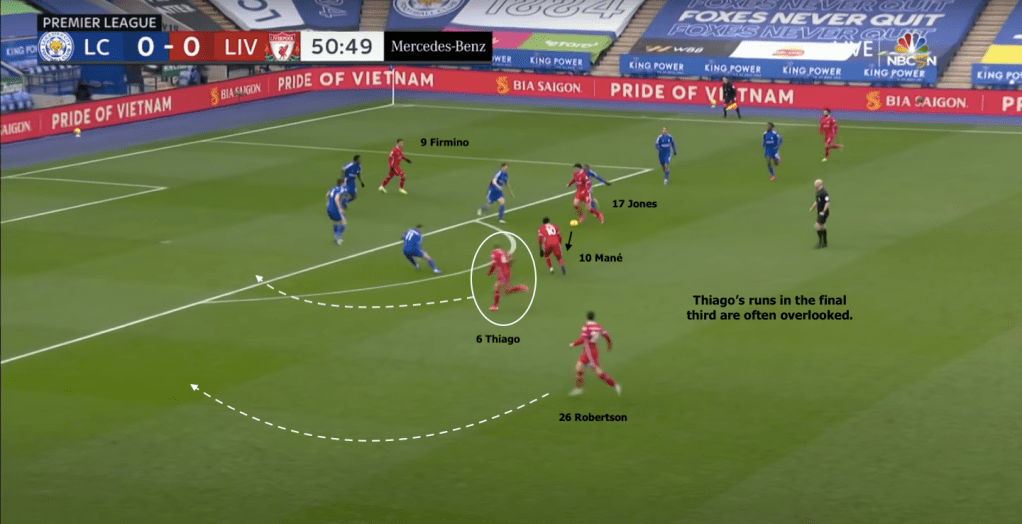 When attacking against a low-block, the fullbacks provide the main source of chance creation, forcing Thiago to make surging Gundogan-like runs into the box, which aren’t his forte (below). Curiously enough, despite being more comfortable as a deeper midfielder, Thiago still often finishes games with a higher average position than Curtis Jones.