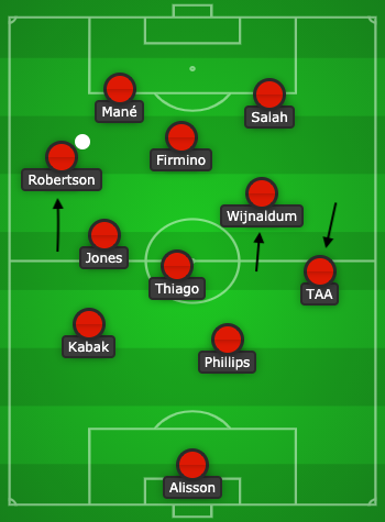 As Robertson is so effective when going forward, he will always have free license to do so. When the ball is on the left, Trent should drop into midfield or alongside the right-sided central defender., adding an additional player to the ‘layer of protection.’ His excellent deliveries from deep can still be used to great effect. When the ball is out right, Jones should cover for Robertson (as he’ll always get forward), keeping the same shape as in the prior scenario. These will create two banks of two (Thiago-TAA + Kabak-Phillips; Jones-Thiago +Kabak-Phillips) players along the halfway line, providing Klopp with the comfort he so desperately desires (below).