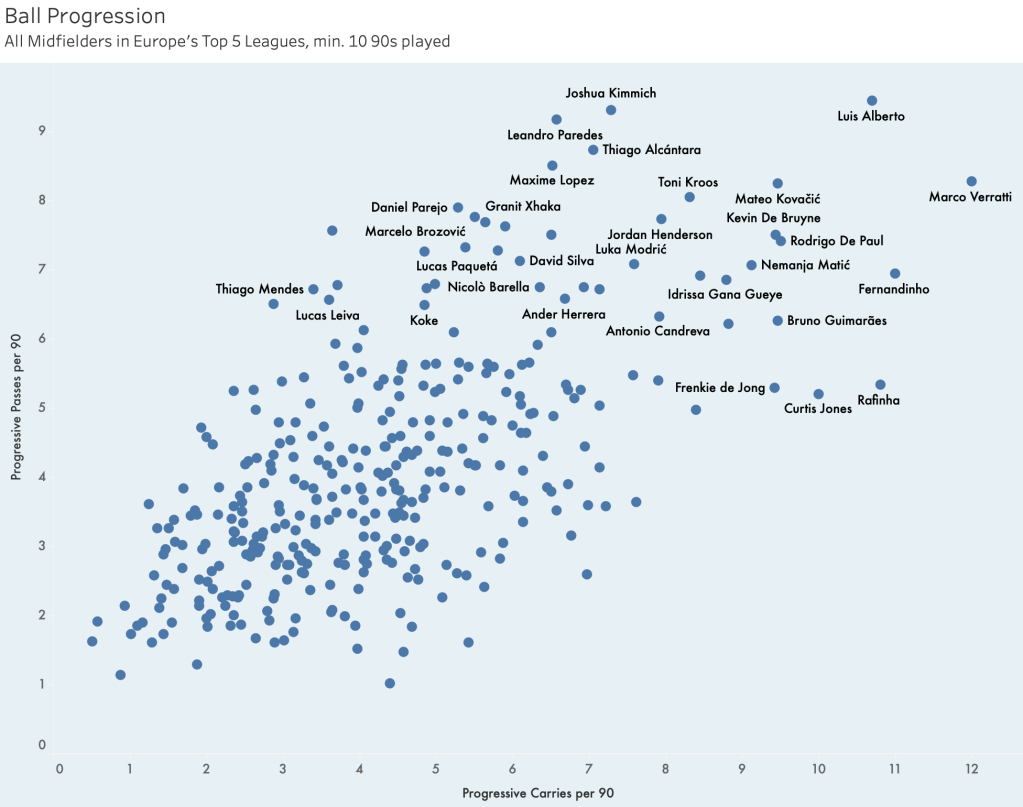 It’s no surprise that the most progressive midfielders are some of the most renowned players in world football. The scatterplot below emphasizes this point — Real Madrid’s midfield pair of Toni Kroos and Luka Modric, PSG’s Marco Veratti, Bayern’s ever-improving Joshua Kimmich, Serie A stars Rodrigo De Paul and Luis Alberto, and Kevin De Bruyne are just a handful of those that top the charts. Their ability to move the ball forward both through progressive passes and carries are invaluable traits to possess.