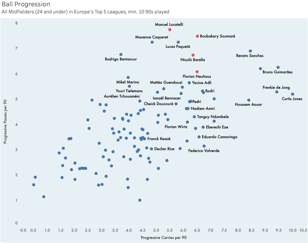 The majority of those that trend towards the top of the above graph are either in their late 20s or early 30s, and are already at some of the elite clubs in Europe. Finding the next set of central midfielders that are producing or showing signs of replicating such impressive progressive numbers will undoubtedly be at the top of many sides’ wishlists this summer. Using data and video scouting, we’ve picked out four ‘24 and under’ midfielders (in red in the below scatterplot) that, in different ways, excel as ball carriers/progressive passers, and explain exactly why they’re such an intriguing option for so many sides in the coming transfer window.