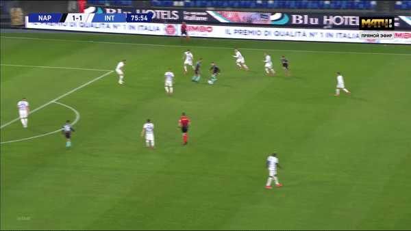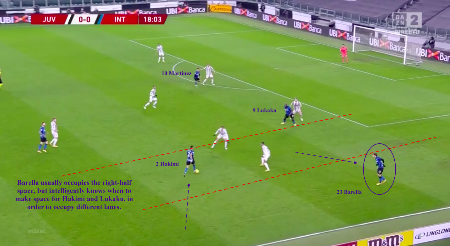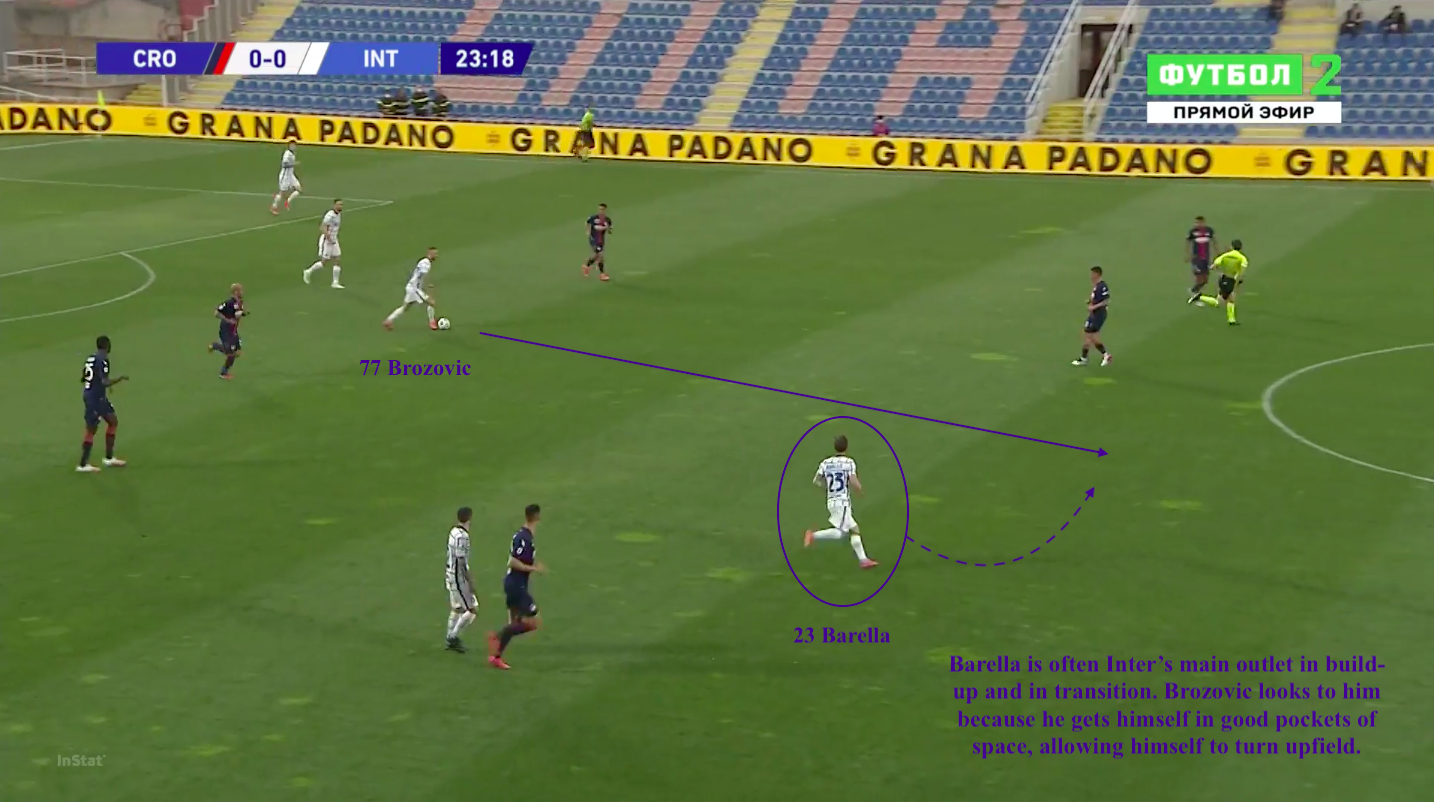 The ways in which Barella influences proceedings morphs in different games and scenarios, too. If the deep-lying Brozovic is occupied, Barella makes himself an option in the buildup; if there’s an opportunity for an overload on the right, he and Hakimi combine, often to great effect; if there’s a gap to receive the ball in advanced areas, Barella’s usually occupying that space.