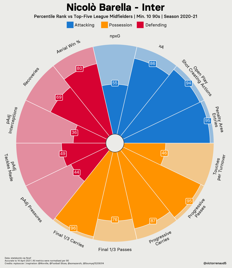 Yet despite his constant and infectious energy, his recent improvement has come as he’s learned to pair this with his ever-developing understanding of the game. He’s relentless and measured at the same time – constantly moving into smart areas to receive possession before driving forward with intent. The above visual highlights his influence in the final-third (he ranks in the 85th percentile or above in final third carries, penalty area entries, open play SCAs, and xA). In finding an ideal role in Inter’s lineup, he’s become a more consistent and reliable attacking threat while working behind the dynamic and dangerous Lukaku and Lautaro Martinez.