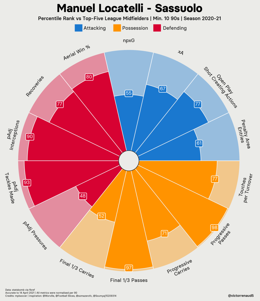 A midfielder with the dual ability to progress the ball in possession and thwart attacks without it is a rare, but invaluable trait. The below slideshow provides further visuals of his skillset. Locatelli will have been disappointed his career at Milan didn’t work out, but he’s used that as motivation, and matured into one of the finer young midfielders in world football.