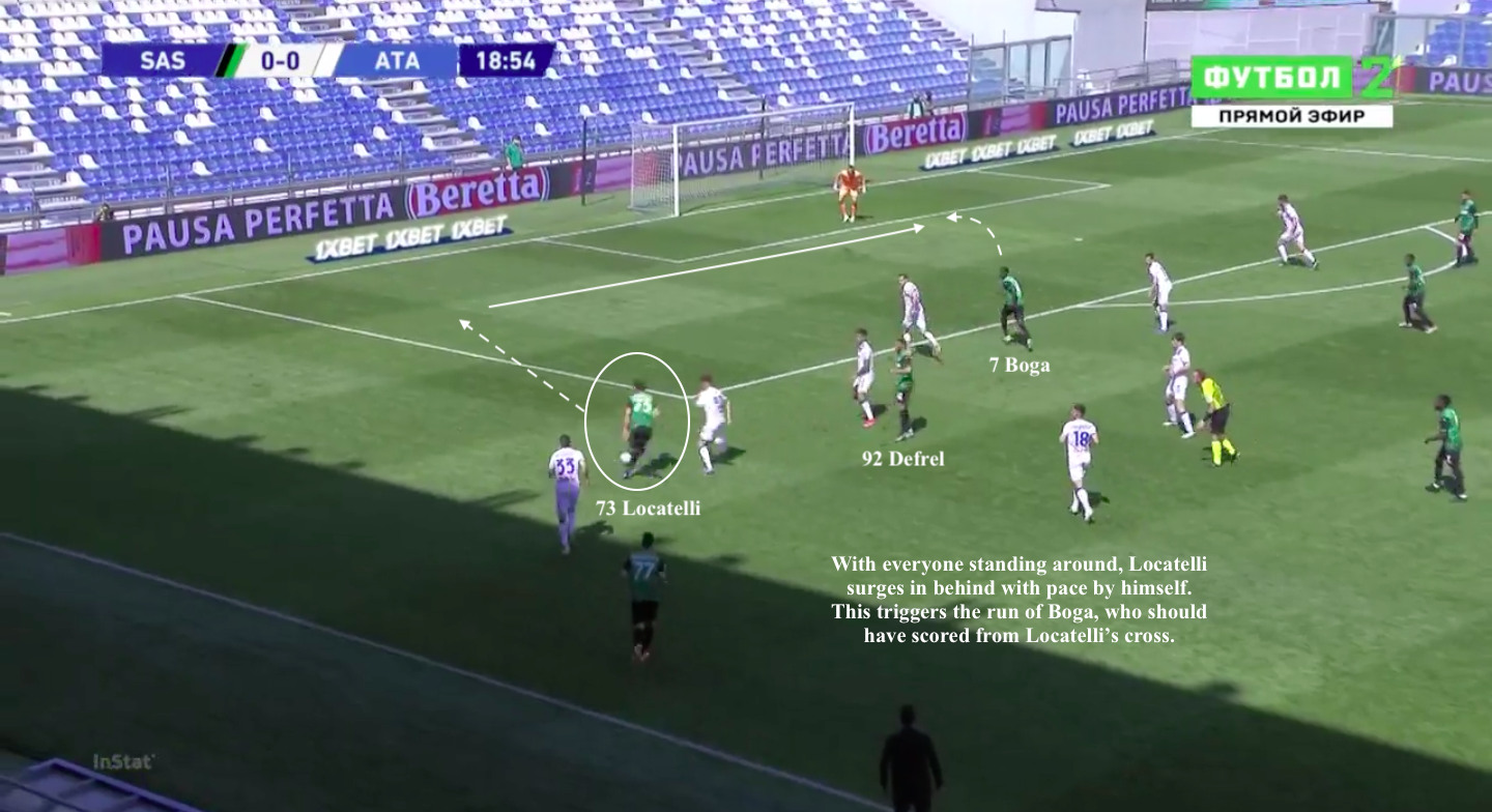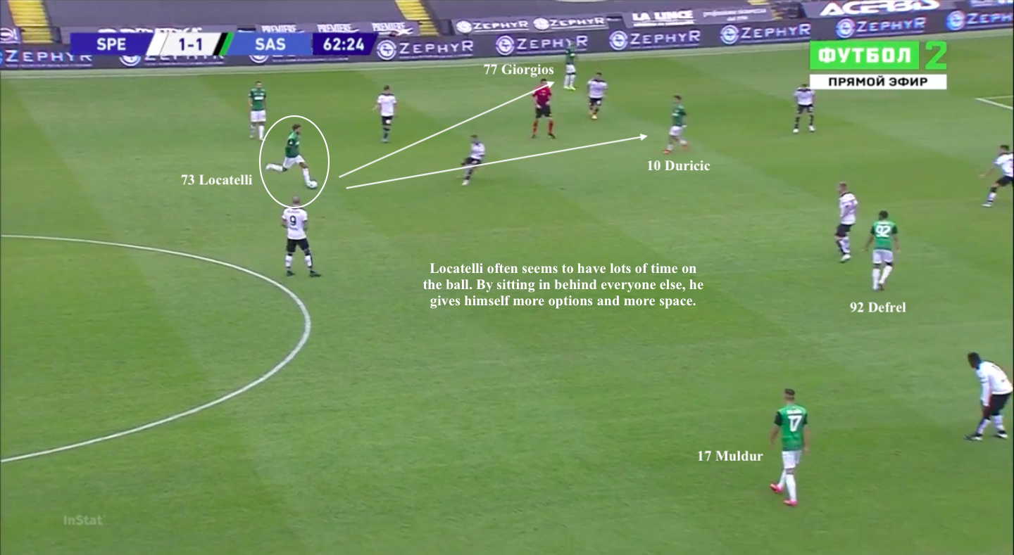 That decision surely still haunts the Rossoneri. His development since has been astounding – now 22, he’s one of Serie A’s finest midfielders and a regular at international level. Most often deployed on the left of a midfield pivot in Sassuolo’s 4-2-3-1 system, Locatelli is an exceptional distributor of possession. He seems to always have proceedings under a spell – with an uncanny ability to dictate the tempo to his desired pace – before switching play from left to right or fizzing a pass between the lines. His ability to progress the ball into the next phase of play is right up there with the best in Europe (only five players average more than his 7.90 progressive passes p/90). He often baits opposition players into pressing, before bypassing them and kickstarting forward moves.