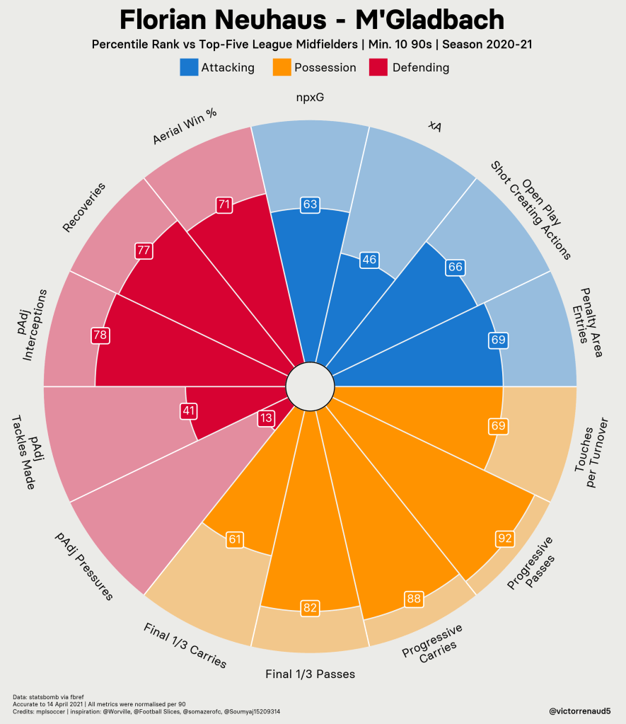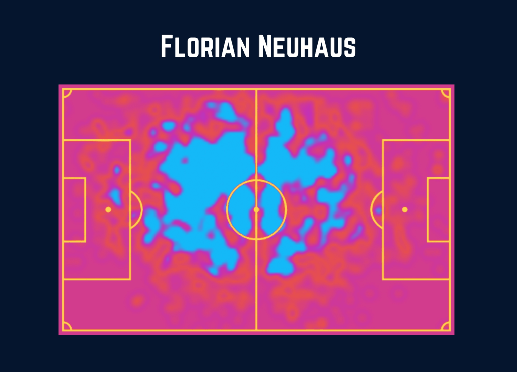 After a loan spell at 2. Bundesliga side Fortuna Düsseldorf in 2017/18, Florian Neuhaus broke into the first-team setup at Gladbach the next season, and hasn’t looked back since. His progression, especially since current head coach Marco Rose took over, has been really encouraging. He’s played both in deeper midfield roles or as a more advanced no. 10, but the majority of his minutes (and where he looks most comfortable) is as one of the two in a pivot in Gladbach’s 4-2-3-1.