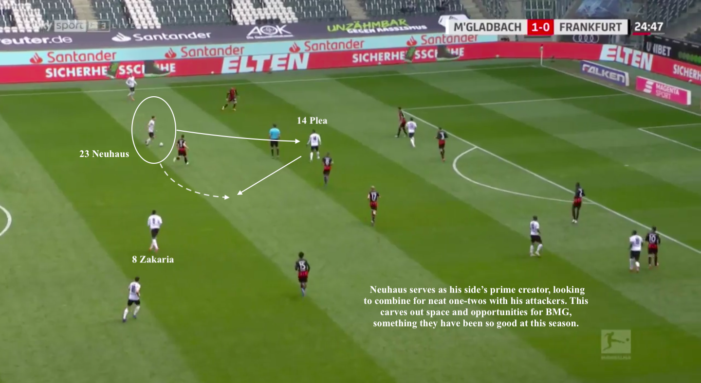 The first clip in the below slideshow may be the pass of the season from any player in Europe. That technique, and execution, is a staple of Neuhaus’ game. His range, weight of pass, vision, and vertical tendencies are all fantastic, and the way he angles his body in possession means he can execute a wide array of passes – a quick one-two, a driven ball to feet, a lofted switch, or a curled pass in behind.