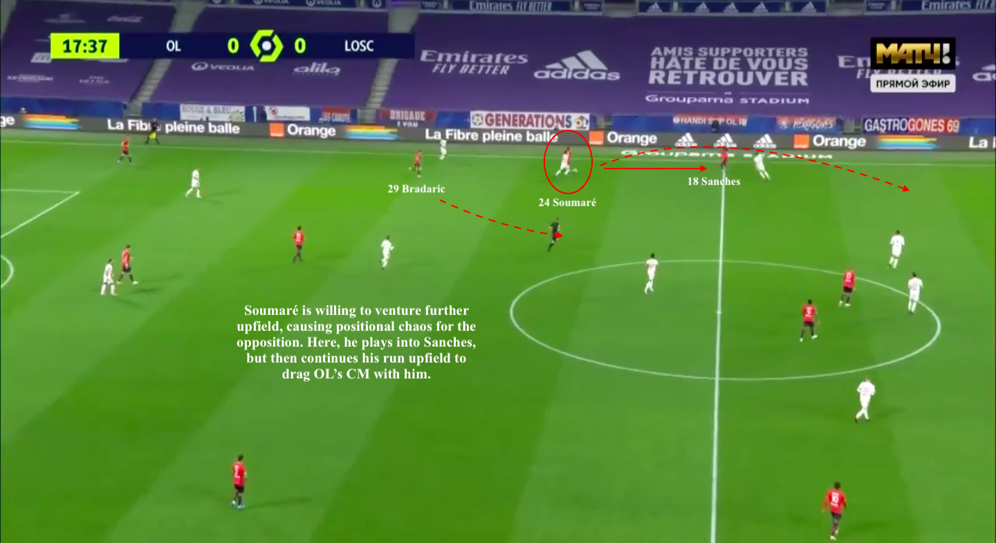 Soumaré’s verticality in possession is outstanding, and the numbers back up what you see. His progressive passes (6.8), carries (6.01), and final third passes (8.34) per 90 are all at the elite level compared to the rest of Europe’s central midfielders – the combination of superb technicality and strong physical traits means he’s so effective at progressing the ball from deep into advanced areas. He spots and subsequently evades pressure really well – either by way of a quick release with a crisp pass into a teammates’ stride or through a strong burst into space with the ball at his feet.