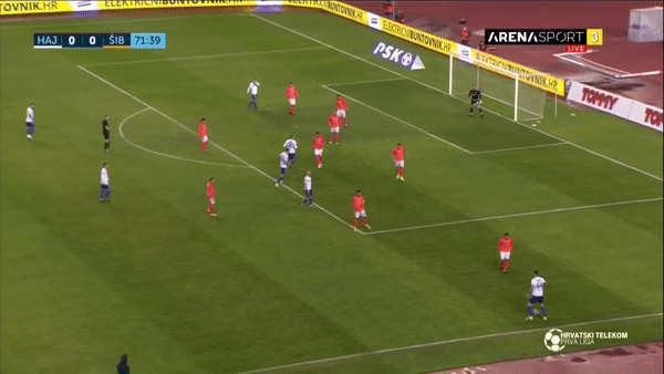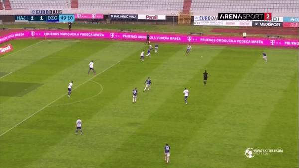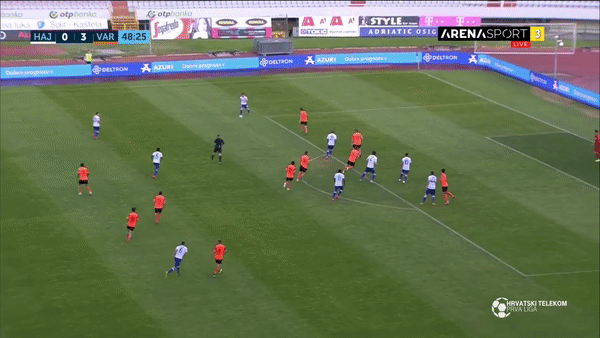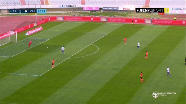 The 19 year old’s most impressive trait is, without question, his passing. A common routine of Vuskovic’s is to take a touch that opens his body up and moves the ball into space, before scanning the field to find open teammates and attempting a pass down the line or across to the opposite winger. Vuskovic’s range of passing often leads to over the top switches of play, turning opposition backlines around and kickstarting forward moves. Ranking 13th for total progressive passes across the 20/21 HNL season and averaging 8.46 progressive passes per 90, the Split born defender racks up impressive numbers for a teenager.