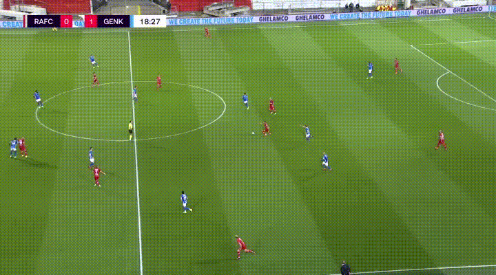 Heynen’s main strength is his ability to receive passes from deep positions into midfield, particularly under pressure, becoming an outlet when Genk are looking to build from the back. The combination of constant scanning and a great first touch enables him to get the ball out from his feet quickly and release passes before his man gets too close. His 6’0” stature allows him to hold players off, often getting his body between the opponent and the ball, giving him the room to recycle possession back to safety.