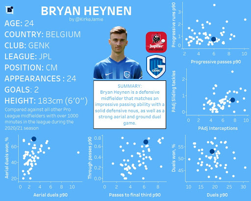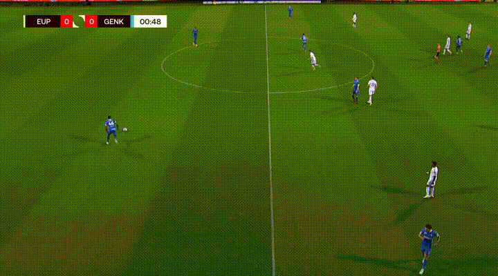 Heynen’s passing is crisp and accurate – he consistently judges the weight of his passes well and often fires the ball into his teammate’s feet, making it difficult for it to be intercepted. He is really smart at playing short, one-touch passes to players around him, before gliding into space for the return ball. He is also able to play longer, drilled passes into the feet of a striker, although he doesn’t do this as often. Last season, Heynen made 6.3 passes into the final 3rd per 90, as well as 0.68 through passes, both of which stack up well against other Jupiler Pro League midfielders. On top of that, despite not being the most progressive player (this is something he could add to his game), he still makes averaged 6.0 progressive passes per, helping Genk move the ball up the pitch. He does this all whilst retaining possession very well, receiving the ball 43.4 times per 90 and completing 87% of his passes.
