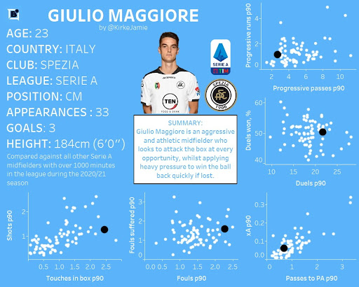 Gallagher is an overwhelmingly active midfielder, constantly looking to make himself available in the box for crosses and cut-backs whilst also helping to lead Palace’s press from the front. Gallagher isn’t an exceptional ball progressor, but he does offer enough technical quality to operate in tight, congested areas around the box. After looking at the data, the best fit for this role I have found is Giulio Maggiore, a 23-year-old central midfielder who currently plays for Spezia Calcio in Serie A.