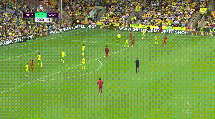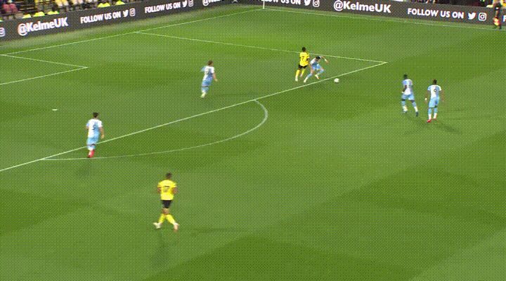 Ngakia’s passing is also very strong, both in execution and his decision-making. Ngakia’s progressive nature is enforced by last season’s numbers, in which he averaged 7.3 progressive passes and 2.2 progressive carries per 90. He often looks to play down the line into space for Ismaïla Sarr, Watford’s RW, although he has also shown the ability to play more diagonal balls into the striker’s feet, and I’m sure with specific instruction he could do this more regularly. Over shorter distances, he’s more than capable of quick interplay, particularly with other wide players — largely facilitated by a deliberate first touch and neat, close control that allows him to receive and release the ball in fluid motions.