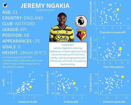 From watching Viera’s team play, it would be fair to say that the right-back position is probably the least well-defined role, so there’s more freedom in identifying a plausible transfer target. Palace often build in a 3-2-5/2-3-5 shape that switches to a 4-3-3/4-4-2 shape when they lose possession, with the RB responsible for providing an outlet on the right-flank to progress the ball and creating triangles with the RCB and the DM. However, Viera has shown a preference towards playing a RW that tends to drift inside, leaving the RB with a lot of space and, therefore, the team needs a player who can both progress the ball effectively and contribute in the final third. Additionally, in some games this season, the RB has received very little support in defensive situations, and therefore any replacement would need to be comfortable defending their flank on their own. With all of this being taken into account, the player I would bring in is Watford’s 21-year-old right back Jeremy Ngakia.