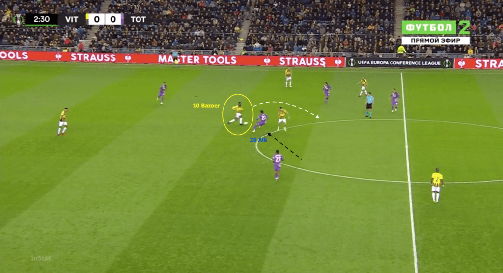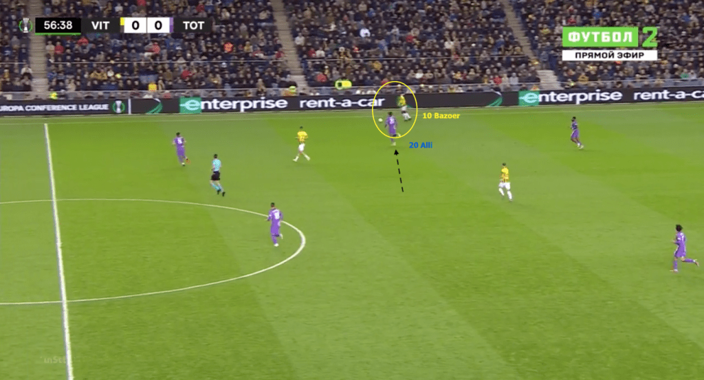 These situations kept occurring. Vitesse would constantly recycle possession back to Bazoer, who would prance his way forward and completely unlock the Spurs press. Spurs’ narrow set up left them vulnerable out wide, in those half spaces just in front of the full backs. Seven minutes later, the same pattern repeated itself…
