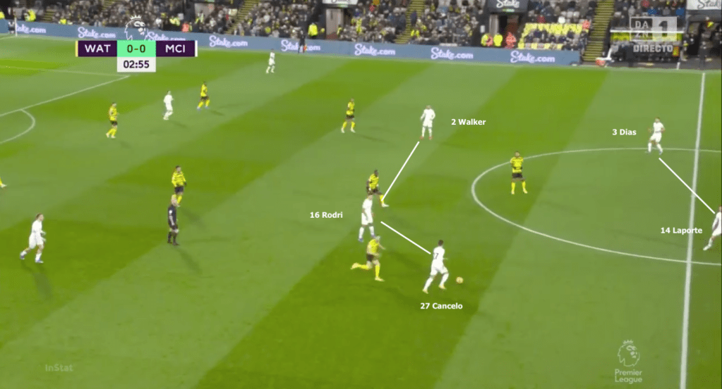 The first is City’s shape in possession. Rather than just have Cancelo tuck into midfield to form a 3-2-5 shape in possession, Guardiola now has both Cancelo and Walker tuck in alongside Rodri, forming a 2-3-5 shape (below). Besides providing better passing lanes thanks to more bodies in the middle of the park, the 2-3-5 shape makes it easier to counterpress. By moving Cancelo and Walker more centrally and higher up, City now has a better chance to win the ball back in advanced areas when they lose it. That alone, conceptually, directly addresses their main weakness from last season: being susceptible to counter attacks.